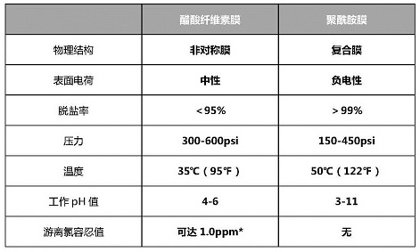 醋酸纖維素膜最高可以耐受1ppm的游離氯,而氯和氧化劑會造成聚酰胺膜損壞。